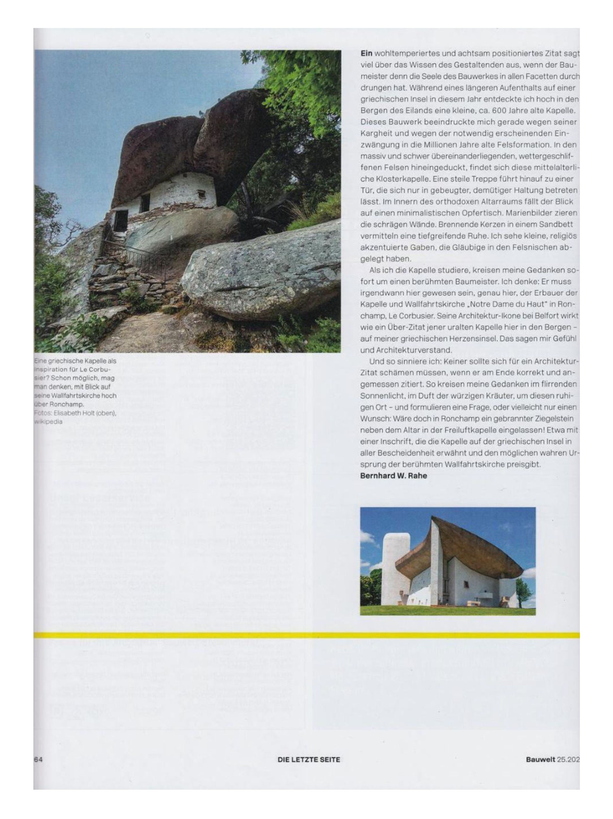 Meine Begeisterung für den Ort auf der Griechischen Insel, auf dem ich die Kapelle erkundete, weckte das Interesse des Bauwelt-Redakteurs.